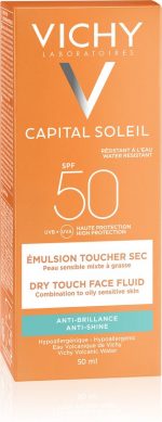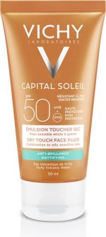 Vichy IdA c al Soleil Mattifying Dry Touch Face Fluid SPF50 This cream has a high protection factor, does not stick and does not leave the skin shiny Protects the skin against the harmful effects of UV rays Is hypoallergenic and dermatologically tested on sensitive skin Contains no parabens Contains soothing strengthening and restorative thermal spring water from Vichy Use Apply before sun exposure and reapply regularly and generously Sweat and dry especially after swimming