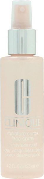 Clinique Moisture Surge Face Spray Thirsty Skin Relief This refreshing facial spray provides the skin with the necessary moisture. The facial spray is full of moisturizers and active aloe vera and is completely fat-free. The spray replenishes the moisture. restores moisture balance and softens and soothes the skin. The spray intended for all skin types is 100 perfume-free and tested for allergies. Use Hold the spray at a distance of 25 to 30 cm from the face. Close the eyes and spray a light mist. Use as a supplement to the daily routine. moisturizer under or over make-up where the skin needs hydration