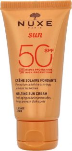Nuxe Sun CrA me Fondante SPF50 This meltingly soft cream with a holiday scent, an innovation from Nuxe, guarantees a 100 enchanting color in peace. It protects against UVAUVB premature skin aging due to sunlight limits the appearance of spots, hydrates and soothes. The ideally protective skin gets a beautiful and long-lasting tan. Use Apply the product liberally before going into the sun