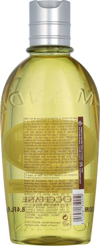 L Occitane Amande Huile de Douche Oil This oil softens the skin thanks to the presence of sweet almond oil It is rich in nourishing lipids and respects the natural hydration of the epidermis A very light soft and satiny layer with a light scent of fresh almonds left on the skin. Use Apply to wet skin, rinse thoroughly