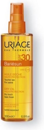Uriage BariA c sun Huile SA che SPF30 Dry Oil SPF30 This dry oil provides protection against UVA UVB free radicals and dehydration. Moreover, it gives your tanning skin a beautiful satin shine. Spray liberally. before sunbathing, e.g. spray 8 times on the calf. By cutting back on the product, you reduce the protection. Reapply regularly, especially if you perspire a lot after swimming or after drying off. Use Apply sufficient product to the exposed parts before each exposure to the sun. to protect Reapply the product regularly