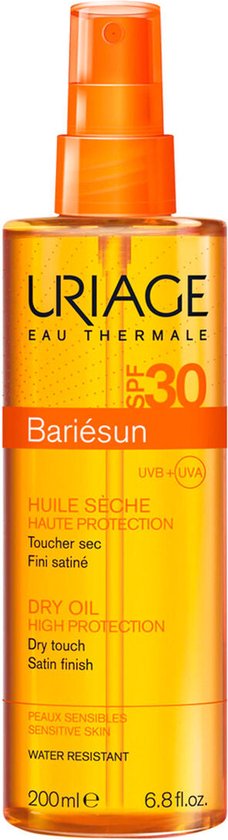 Uriage BariA c sun Huile SA che SPF30 Dry Oil SPF30 This dry oil provides protection against UVA UVB free radicals and dehydration. Moreover, it gives your tanning skin a beautiful satin shine. Spray liberally. before sunbathing, e.g. spray 8 times on the calf. By cutting back on the product, you reduce the protection. Reapply regularly, especially if you perspire a lot after swimming or after drying off. Use Apply sufficient product to the exposed parts before each exposure to the sun. to protect Reapply the product regularly