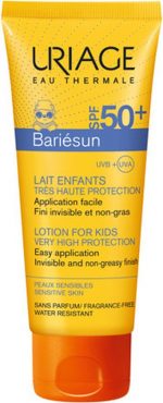 Uriage BariA c sun Lait Enfants SPF50 A fine sunscreen milk with SPF50 specially developed for children with sensitive skin The light, non-greasy texture is easy to apply and is quickly absorbed The formula is enriched with innovative filter complex with very high UV protection Thanks to the addition of aqua spongins and Uriage Thermal Water, the skin is intensely hydrated and well protected. Use liberally on the exposed areas before sunbathing. Reapply regularly, especially during profuse sweating and after swimming