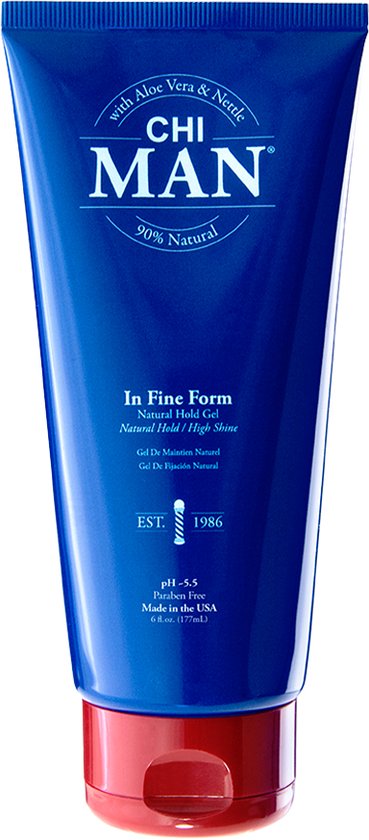 CHI Man In Fine Form Natural Hold Gel 177 ml is a gel, specially developed for men, that provides natural strengthening with lots of shine. Contains Provitamin B5 and Aloe Vera to soothe the skin and protect it against dehydration and irritation. This gel does not contain alcohol, parabens and has not been tested on animals.
