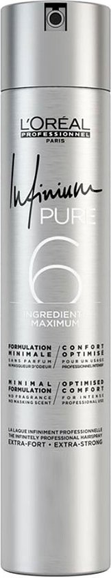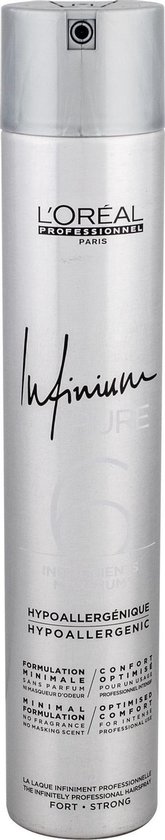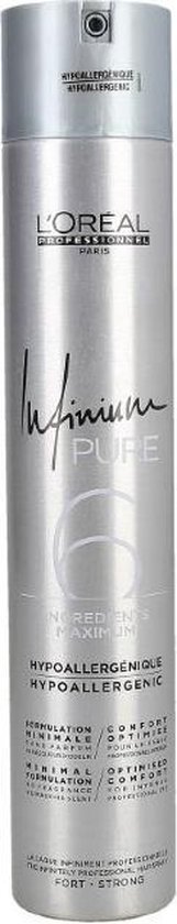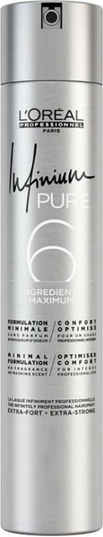 LOrA c al Infinium Pure The Infinitely Professional Hairspray Fort Strong The endless professional hair spray a backstage icon Strong new formula without perfume or masking scent neutral odor during application and leaves no scent behind The finest professional spray optimal comfort adapted for intensive professional use immediate hold without stiff effect ultra dry no visible residues optimal shine
