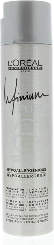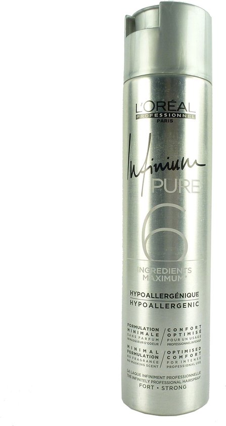 LOrA c al Infinium Pure The Infinitely Professional Hairspray Extra Fort Extra Strong The endless professional hairspray a backstage icon Extra strong new formula without perfume or masking scent neutral odor during application and leaves no odor behind The finest professional spray optimal comfort adapted for intensive professional use immediate hold without stiff effect ultra dry no visible residues optimal shine