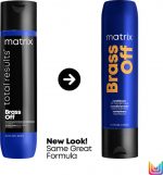 Matrix Total Results Brass Off Conditioner The Brass Off conditioner with vitamin oil helps make blond hair smooth, soft and supple. After use, dry and damaged hair feels silky smooth and restored. on The conditioner is intended to nourish the hair WITHOUT a pump Use Apply after using Brass Off Shampoo on towel-dried hair Massage the conditioner and rinse