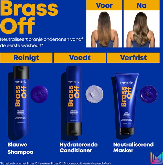 Matrix Total Results Brass Off Conditioner The Brass Off conditioner with vitamin oil helps make blond hair smooth, soft and supple. After use, dry and damaged hair feels silky smooth and restored. on The conditioner is intended to nourish the hair WITHOUT a pump Use Apply after using Brass Off Shampoo on towel-dried hair Massage the conditioner and rinse
