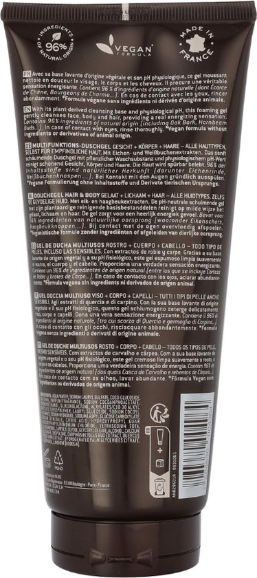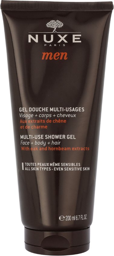 Nuxe Men Gel Shower Multi Usages The pH neutral foaming gel with its vegetable cleansing basic ingredients gently cleanses the face, body and hair. The gel provides a wonderfully energetic feeling. Contains 95 ingredients. >