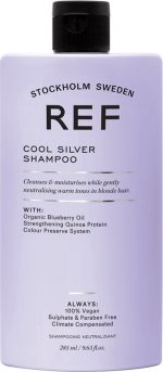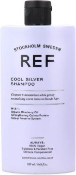 REF Cool Silver Shampoo A rich creamy shampoo with violet pigments. These pigments ensure that unwanted yellow or copper shades in blond hair and sun-bleached hair are neutralized. In addition, gray hair gets a silver glow. Use Small amount. Apply to damp hair Leave on for 5 minutes Rinse carefully The shampoo can be used twice a day