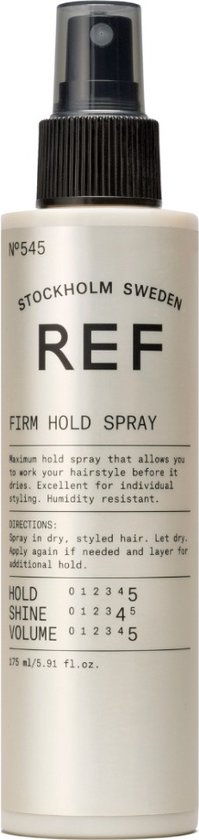 REF Firm Hold Spray NAdeg545 Hold 5 Shine 4 Volume 5 This hair spray provides maximum grip to create your hairstyle before it dries. An extra firm hairspray that gives volume to the hair The spray is perfect for individual styling and is also moisture resistant Use Spray in dry styled hair Let the spray dry after application If necessary, repeat use for maximum fixation