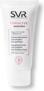 SVR Topialyse CrA me BarriA re BarriA re crA me for irritated or reactive skin scratching stress and daily harmful influences dry skin with a tendency to atopy the prevention of deposits related to detergents Suitable for face body and skin folds of babies, children and adults Enriched with Omega 3 6 9 ceramides Hyaluronic acid restores the skin barrier protects Regulatory Peptides strengthened anti-irritant effect and prevents scratching Nourishing and soothing non-greasy texture water-resistant Use Apply 2 to 3 times a day Reapply as often as necessary Hypoallergenic
